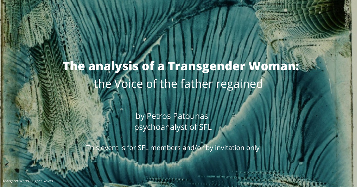 On 4th of September 2021 Petros Patounas, psychoanalyst of the School of the Freudian Letter, will present a seminar entitled 'The analysis of a Transgender Woman: the Voice of the father regained'.